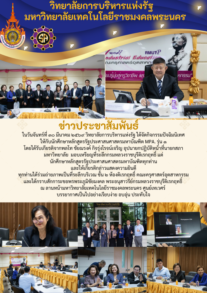 วิทยาลัยการบริหารแห่งรัฐ มหาวิทยาลัยเทคโนโลยีราชมงคลพระนคร ได้จัดกิจกรรมปัจฉิมนิเทศให้กับนักศึกษาหลักสูตรรัฐประศาสนตรมหาบัณฑิต MPA.รุ่น 1